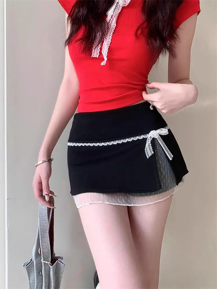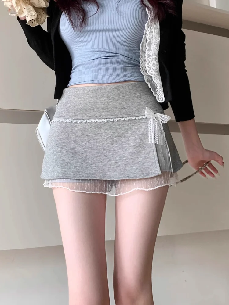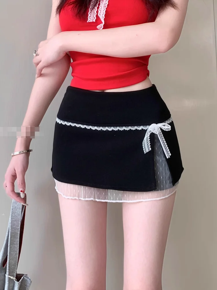 Sweet Lace Patchwork Women Skirts Summer Japanese Kawaii Bow Mini Skirts Fashion Low Waist Preppy Slit A Line Skirts New